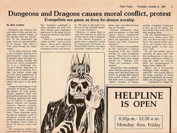 Με τη δημοτικότητα, όμως, ήρθε και η παρεξήγηση. Κάπου ανάμεσα στην αυξανόμενη αγάπη για τη φαντασία και την κοινωνική ανησυχία για τα “σκοτεινά” θέματα, το D&D βρέθηκε στο επίκεντρο μιας ηθικής πανικού γνωστής και ως “Satanic Panic”.