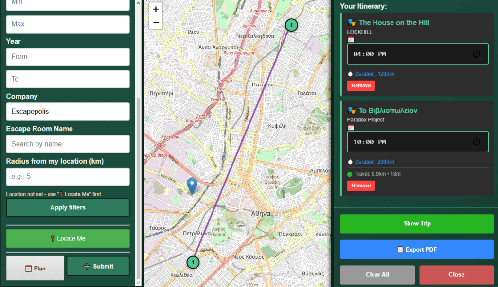 Η εφαρμογή προσφέρει επίσης αναζήτηση βάσει τοποθεσίας, επιτρέποντας στον χρήστη να ορίσει τη θέση του και την ακτίνα απόστασης στην οποία θέλει να εμφανίζονται αποτελέσματα. Επιπλέον, δίνεται η δυνατότητα δημιουργίας προσωπικού πλάνου (itinerary), όπου μπορείτε να οργανώσετε τα δωμάτια που σκοπεύετε να παίξετε, ορίζοντας ημέρα και ώρα.